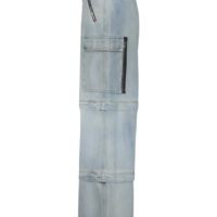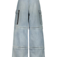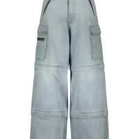 Vetements transformer baggy jeans , belt loops and D-ring hardware at waistband, four-pocket styling, cargo pockets, 2 circular zips to create 3 different lengths of the trousers