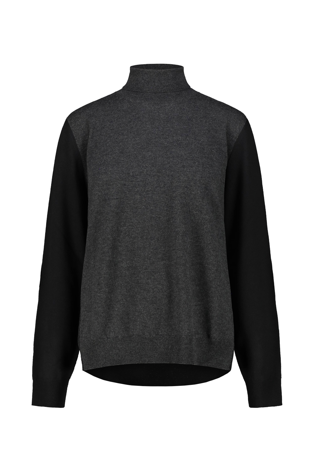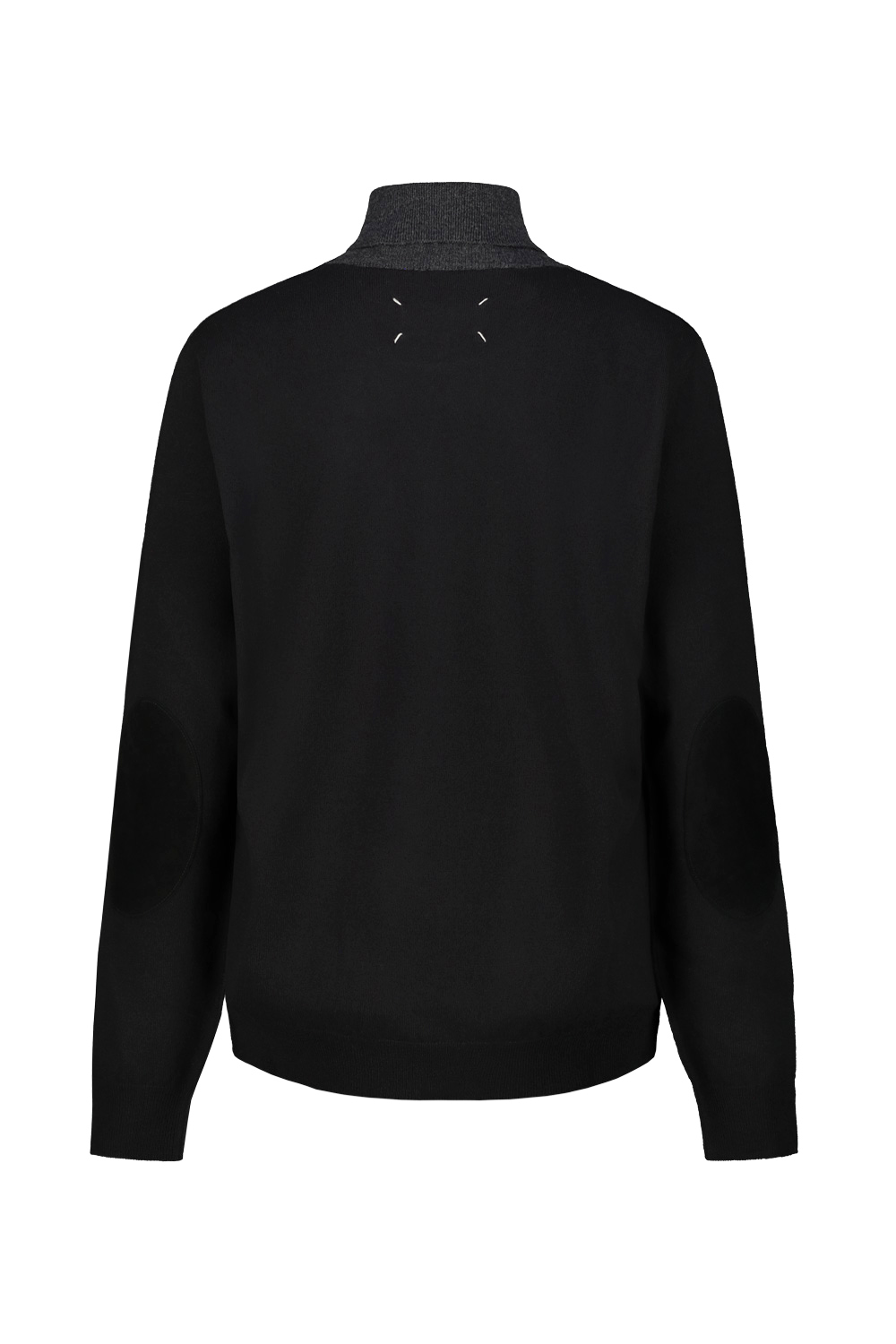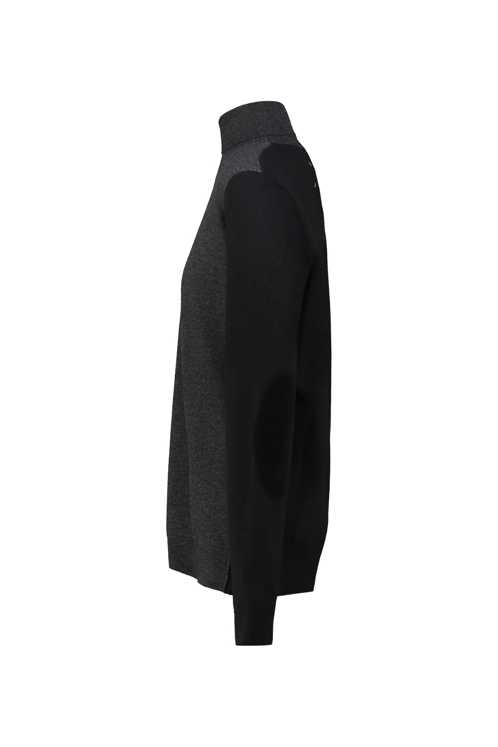 Maison Margiela turtleneck sweater with grey front and black back and sleeves with suede elbow patches.