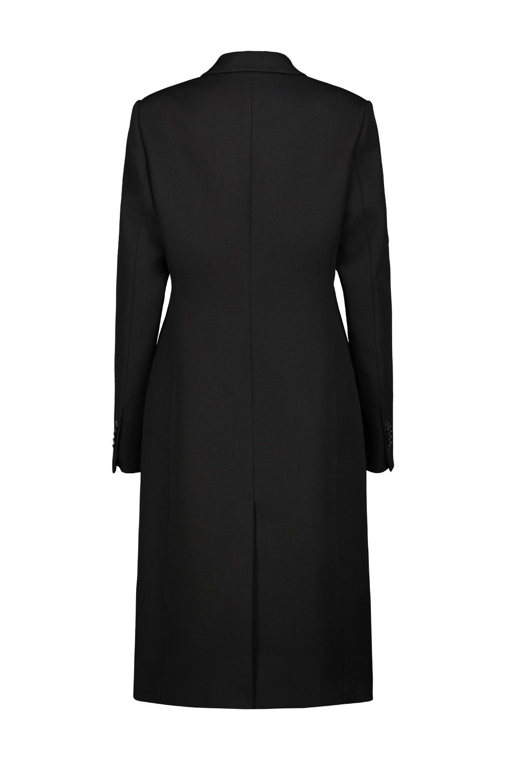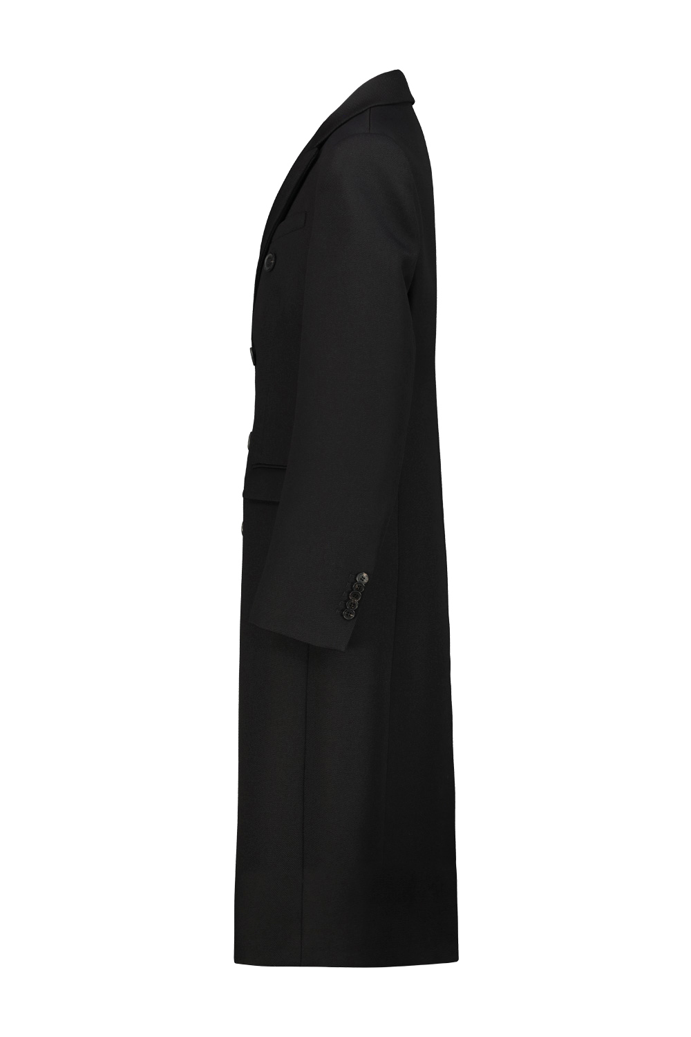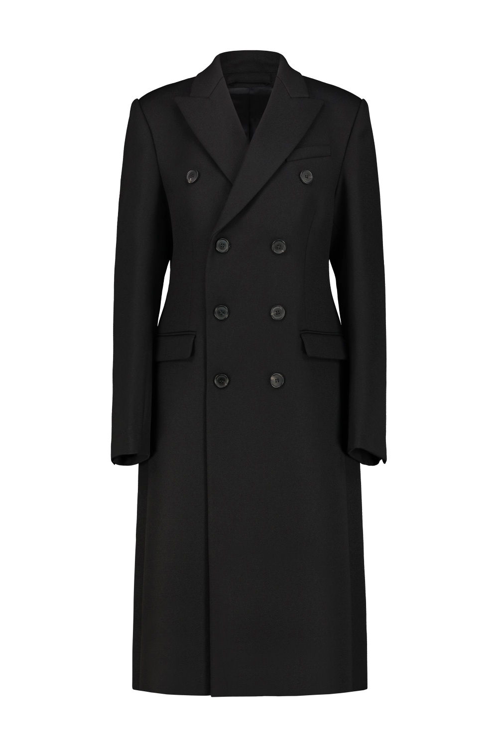 Wardrobe.nyc double breasted coat in merino wool twill, sculptural hourglass silhouette, defined shoulders.