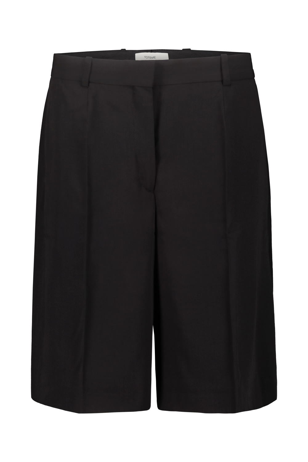 Toteme wide fluid shorts in viscose, knee-length, wide hem, traditional tailoring cues.